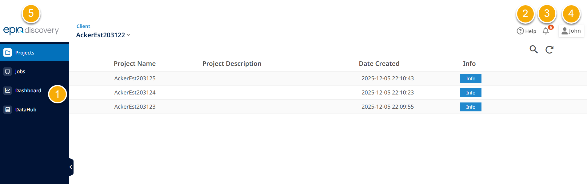 Epiq Discovery provides the ability to view information in two specific forms. When granted permission, you can view information about all projects in the client for more global information. You can also drill into each project to view all phases of the project down to specific jobs.