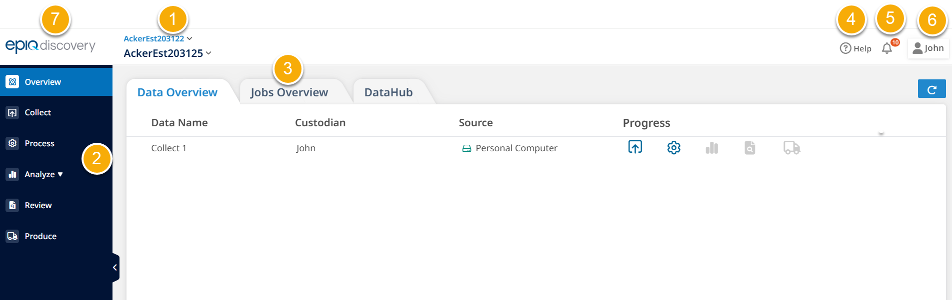 - Project pages provide access to data and jobs. Each individual project consists of data sets in specific phases of work. When you manipulate data in any way, Epiq Discovery creates a job to track that work. Jobs track when you collect, process, filter, promote, create a theme wheel, run reports, and perform any action that produces output.