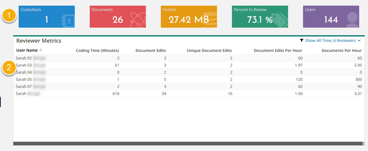 - table provides insights into reviewer productivity and overall review speed. For more information about reviewer metrics, refer to the following topics.