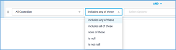 Also, for single-choice and multiple-choice fields, the operator drop-down list replaces the equals operator with the following options.